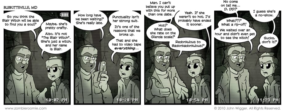 I remember when "The Blair Witch Project" came out and the hype created such a demand to see the flick that it was sold out for weeks around here. Around my cousin's wedding several of us tried going to see it and we went to something like five or six theaters in an evening and every single showing was sold out. I eventually saw it on a date and the audience was not happy with the ending. I recall one guy yelling, "Aw come on, that's bullshit!" It would seem that the witch has bought into the hype and has begun recording everything... including John and George for today's strip. Queue some up the nose shot of someone crying and we've got a movie~!