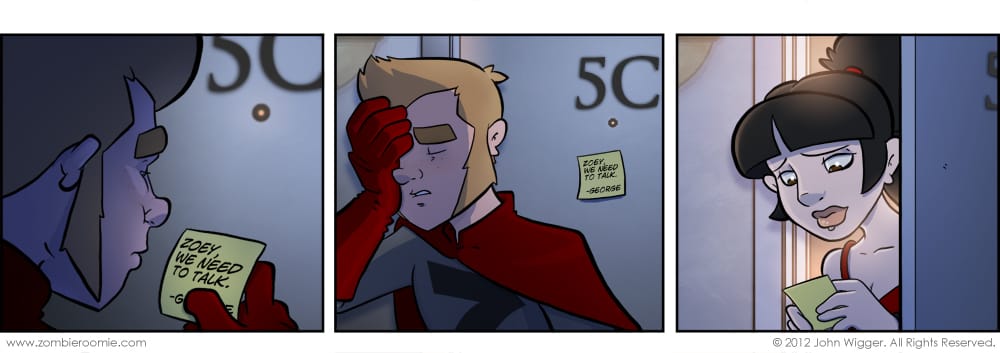 Zoey was the third character introduced to the cast back very early in the run of strips, but I've never shown her without her hair up in her dual pigtails and in at least some makeup. I didn't want to have her done up in her traditional look as it's supposed to be the butt crack of dawn after George has gotten back from the night of dealing with the zombie Santa deal... I wanted to show her when she's just around her apartment... a little more relaxed. Originally I wasn't going to jump right into the next storyline, don't worry it's a lot shorter than the Santa arc...