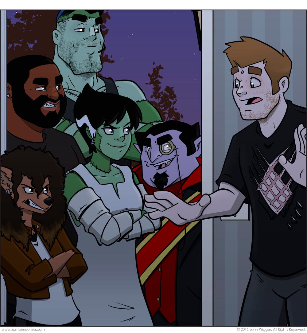 Blaine didn't count on Lyn having even more backup... but we knew she did. I wasn't happy with trying to shove a doorway full of characters into a three panel strip's panel so instead I did another triple sized update which will eventually be a full page in a book. It's the same idea for the update with Lyn jumping in the air before Blaine went super weird looking. There's another big, single panel update planned in this arc but it's a bit aways. Now I'm going to hit the sack. tt4n.