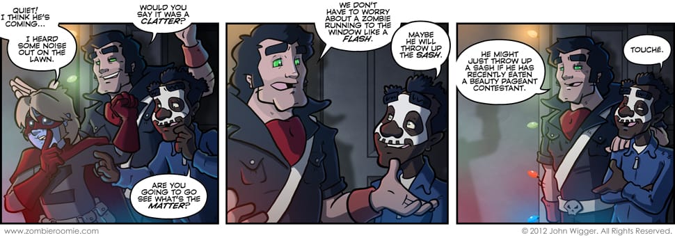 Comics on Thursday... weird. In thinking about how silly it was to do the 'Twas the night before Christmas style narration that started on Tuesday's comic... I came up with the comic to make fun of it. When I was little, I always thought the lyric/line was "Away to the window I flew like the Flash". See the Flash is really fast. It made sense to me. Panel one of today's comic has my favorite drawing of Hunter to date. Tomorrow's comic will have zombie Santa in it, finally~!