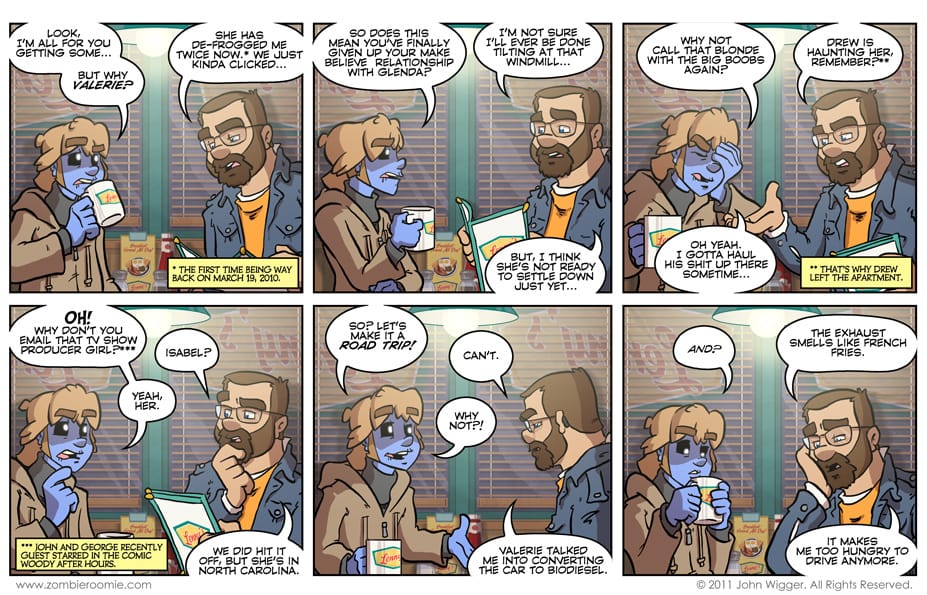 The restaurant the guys are in is supposed to be the same one as they were in for the wrap up of 2009's Christmas story, "Hold yourself together". I just have gotten a lot better at doing backgrounds and just general cartooning since then. Speaking of backgrounds, this Lenny's restaurant might be my favorite background I've ever done for Zombie Roomie... It just works. Here are the links to what the editorial boxes refer to: Panel 1: "The first time being way back on March 19, 2010. Panel 3: That's why Drew left the apartment. Panel 4: John and George recently guest starred in the comic Woody After Hours.