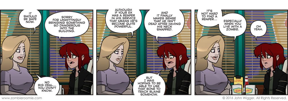 The girls put the leg somewhere safe off screen that will come up later... it just isn't important now where it is. Now everyone is on the same page where the characters finally know what the audience has known for a couple years. I'm going to try to plot out the next few weeks of strips over the weekend since I know I want somethings to line up with the major stories that we have running. I'm looking forward to where the beats for both land as we progress