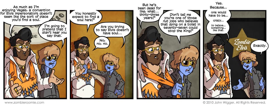 The costumes John & George have on are the same, or supposed to be the same, ones they had way back in the second comic, "George and the fat man". Since there is the obvious comparison between the two comics... I'm amazed at the progress I've made in less than a year at this cartooning deal. Virtual patting on my own shoulder. Wednesday we see more of the zombie Elvis situation, so... I'd thank you, thank you very much if you came back to check it out later this week. Yeah, that was lame. My bad. -- BTW: We're entering the home stretch of the "World Tour/ Search for a soul" storyline. Including this comic, there are only three weeks/or nine comics until it's over and done with. It's been a super long over-arcing plot, but hopefully the individual comics have made you laugh or at least smirk.