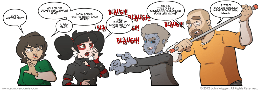 I know I've done a few one panels lately, but sometimes the way I have the plot progress in my head requires a simple exposition strip and those tend to fall into the one panel style for me. When we're done with the story arc and where it leads to I'm sure I'll do less one panels and stick with the typical three more often. I've hinted at it for a while and I haven't out right said that it's the case, but yeah... George is a mindless zombie instead of the special case we've grown accustomed to in ZR over the years. One of the world building things I wanted to get done with this arc is the explanation of zombies as a whole in the Zombie Roomie universe... and how/why they're different from what you see in movies and television. His eyes are also very blue in this strip... that's on purpose.