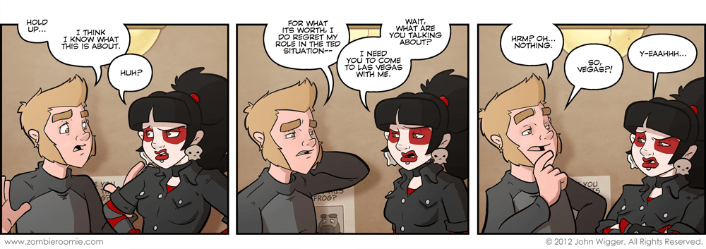 I realized that yesterday's strip didn't even mention Vegas once but it still had the title "What happens in Vegas...". That's because I knew what the arc is about and I wanted something that would work for the whole thing... I hope you weren't too confused by it. The Ted situation in question is George's plan to break up Ted and Zoey by inflating Ted's ego with getting his band some gigs at Vlad's. The relevant strips are found hereherehere, and here.
