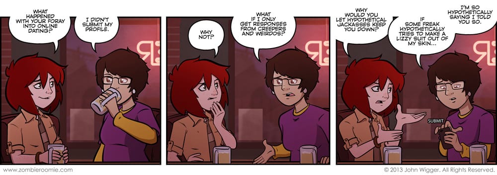 I figured it was more than time to move the arc along. We'll finally be getting somewhere this Friday and the following week. I'm really liking Lyn's redesign here. I've still got some tweaking to do on a few things, but her new look works so much better for me. Sure it would still work with lipstick-style lips, but I don't think she needs them. I wrestled with where to put this scene. At first it would have been in John's apartment and they were going to be playing video games (sans pants)... but I figured they deserved a night out.