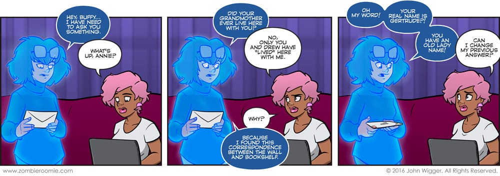 I was pretty blocked for what to do next in the Glenda and Lizzy arc so I tried figuring out something for anyone to do and I decided it was time to get back to Buffy and Annie. Soon after I came up with the idea for Buffy I knew I wanted her to have an old lady name that she was hiding... so we finally learn what she's been keeping to herself. Also, Annie is a much more powerful ghost than Drew was. She has no problem manipulating physical objects. We'll find out that she's been around a lot longer than Drew was.