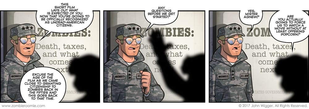 I might be the only one, but when I wrote the bit about Undead-American I giggled. It's so stupid... Yes, this isn't the first time the government tried to make nice with zombies... we'll sort of get some backstory to that as we go along, but it's also something I'd like to visit in another arc later to really flesh it out. I liked some of the film title card stuff I did for this and how the area where the General is standing in front of the screen isn't lit up because he's blocking the projector. I thought that looked pretty nifty. On the broken finger front, I changed my sheets and mattress protector thingy and that little bit of different movement made my broken finger throb with pain. I thought I was a lot better but doing something like that proved I was still injured.