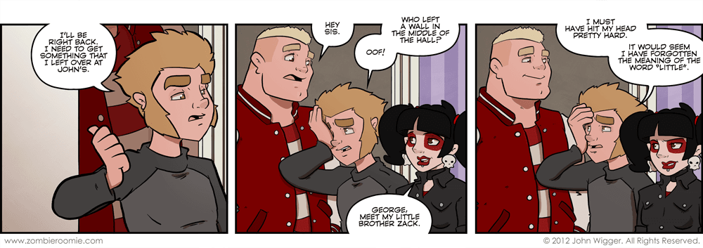 Even though I'm just now getting around to showing them... I've known what Zoey's family has been like for the last two years. Her parents and her little brother have just been living in my brain waiting until it was time for me to put them in the comic. I had an idea that would have been their original introduction a while ago, probably around the time I came up with them... but I'm glad I held off as their character designs are much more solid than they would have been if I rushed them and put them into the comic right after the world tour ended like I was thinking I would. Also, I've decided to put Zoey back in her big assed pigtails as I missed them. I figure since she was manipulating George's 'do... that he would have remarked that he wished she went back to that look. There wasn't anything particularly funny about going back to pigtails over the ponytail so I didn't figure it needed to be a comic.